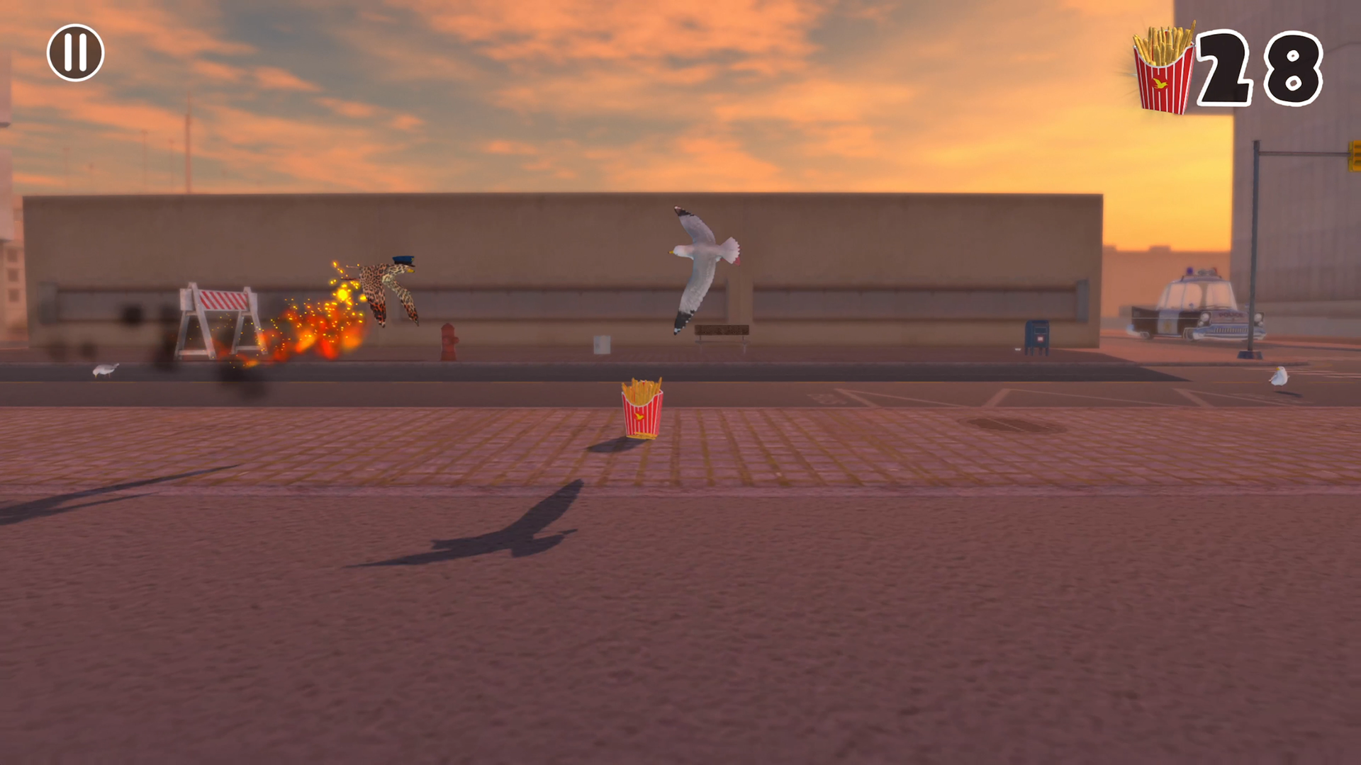 You can tap to flap your wings, and swipe to dodge. As you collect more fries, the procedurally generated obstacles spawn more frequently, and your Beach Chicken moves faster. Fries spawn on the ground, on obstacles, as well as in the air (attached to an umbrella.)