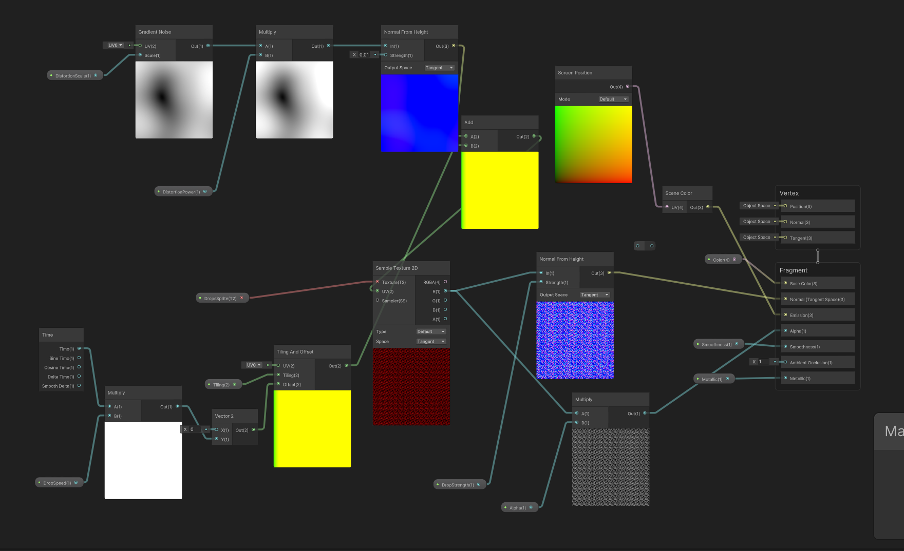To let the user know that a splashback has occurred, I needed to make it look like the screen was wet. To accomplish this, I developed a shader that generates a seamlessly-tiled screen of water drops, distorts them, and applies the result to the normal. The end result is realistic looking water droplets on the screen that lets the player know they were just splashed in the face. The color of the water droplets are also tinted if the splashback came from a dirty dish.